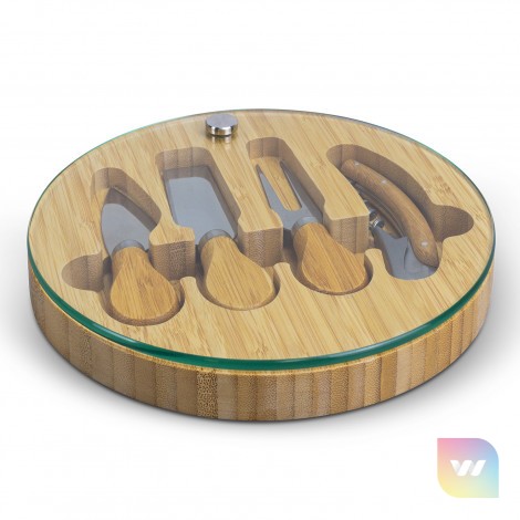 Quality cheese board set with a natural bamboo base and a tempered glass surface that is easy to clean. The set includes two cheese knives, a cheese fork and a bottle opener, all with bamboo handles. The set is presented in natural kraft gift box with NATURA branding.