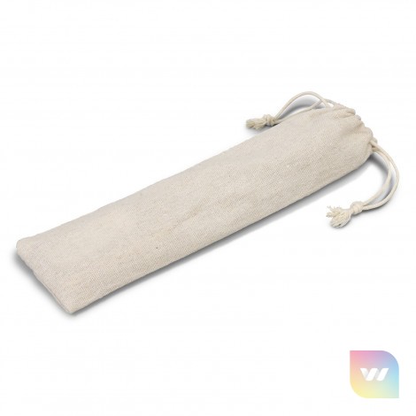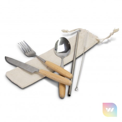 Reusable stainless steel cutlery set stored in a convenient drawstring bag. This set is made from stainless steel and rubberwood which includes a knife, fork, spoon, straw, and straw cleaner.