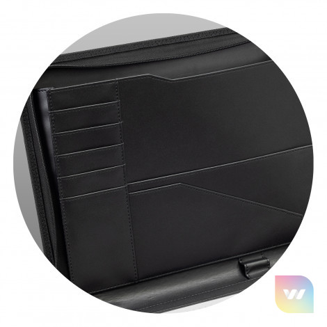 Travel-inspired portfolio case made of PU with foldaway handles. It has a zipped closure as well as two external and three internal document slips. Internal pen loops, a passport/ticket holder, a tablet slip pocket, and six business card holders are also included in the portfolio.