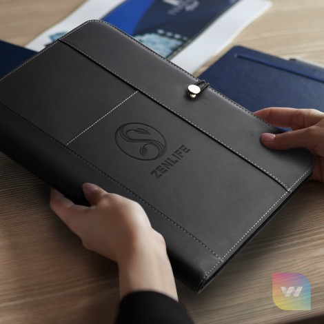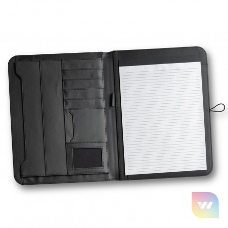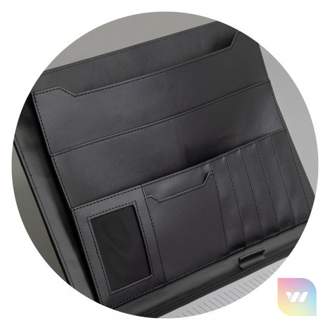 Secure thermo PU leather portfolio with a unique metal and elastic loop closure. It comes with an A4 lined pad, two slip pockets, six business card holders, three large document slip pockets, a fine mesh pocket, and a single card holder.