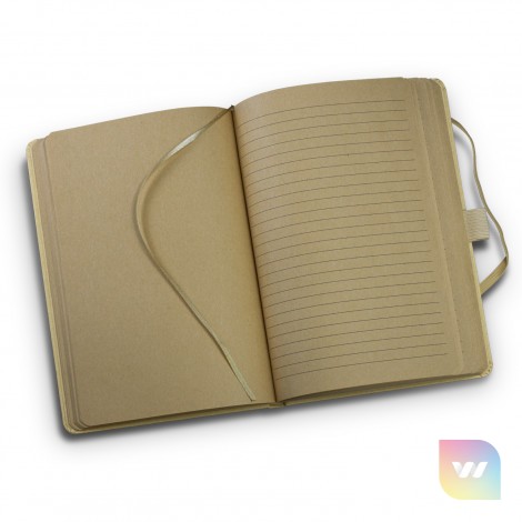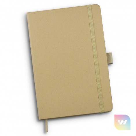 Smart medium-size (approximately A5) notebook with 80 leaves (160 pages) of 70gsm lined and unlined kraft paper and a hard kraft paper cover. It features an elastic closure band, pen loop and a bookmark ribbon. An optional paper belly band is available on request and can be branded in full colour.
