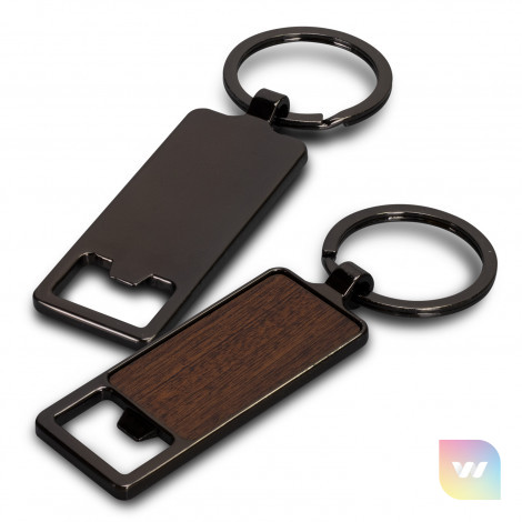 Functional bottle opener keychain has a metal body with a wooden front. It's presented in an individual black box.