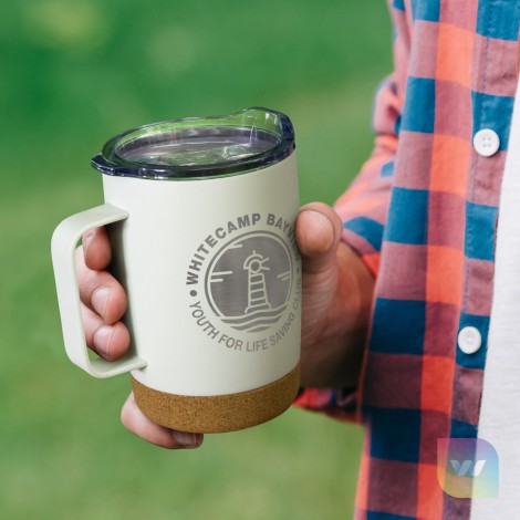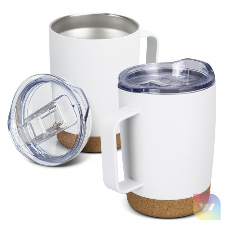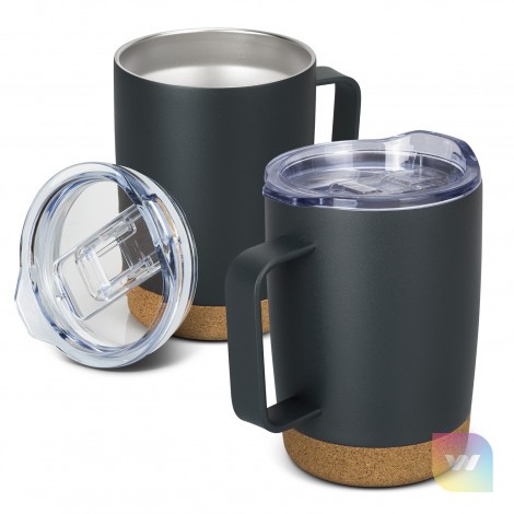 Stylish 350ml stainless steel vacuum insulated mug with a cork base and a tough powder coated finish. It has a transparent push on lid with a sliding closure and is presented in a natural gift box.
