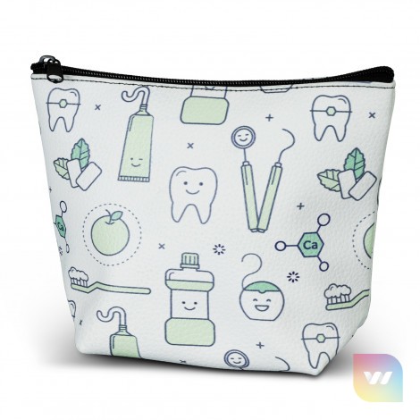Small cosmetic bag manufactured from leather look PU and is branded in full colour on both sides with no extra cost. Belle has a black zipper and the stitching matches the zip colour. A production lead time of 25 working days applies to this product.