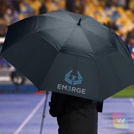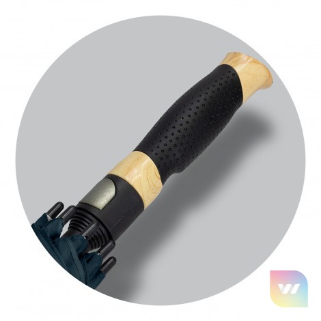 Premium eight-panel sports umbrella with automatic opening. The extra-large vented canopy is made from strong 190T pongee and has 76cm ribs. It has a windproof, wooden-look fibreglass frame and shaft with a wooden-look handle that has a plastic grip.