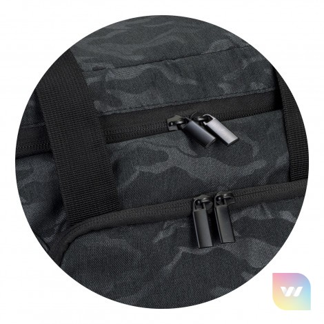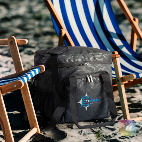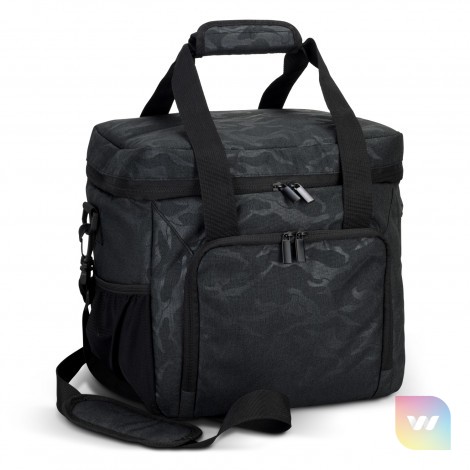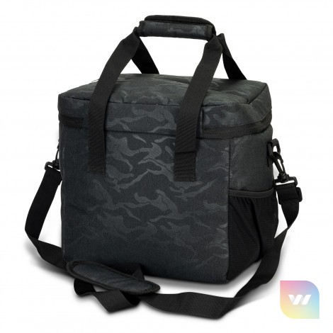 Practical 17L cooler bag manufactured from 300D polyester with a stylised camouflage pattern. The bag has thick PE foam insulation encased in a water-resistant PEVA inner liner. It features an adjustable shoulder strap, a zippered front pocket, two mesh side pockets, and carry handles with a Velcro cuff.