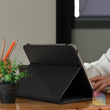 Sturdy tablet case with a stand and PU cover with an elastic closure. It has a silicone tablet grip with expandable straps to fit tablets from 8″ to 11″.