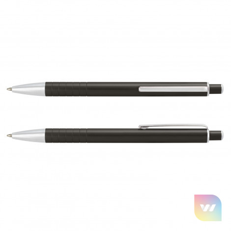 Retractable aluminium ball pen with a matte anodised barrel, a unique patterned grip, and shiny chrome trim. It has 800m of black German manufactured Dokumental ink and can be presented in an optional pen sleeve.