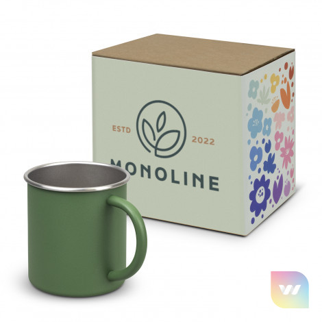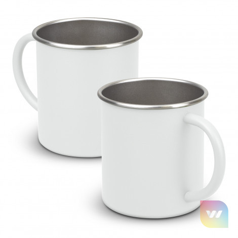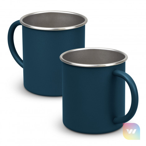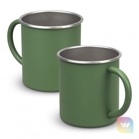 Durable 350ml stainless steel camp mug with a tough powder coated finish, featuring a comfortable round handle and silver trim.