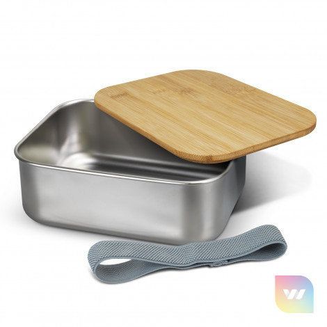 Versatile stainless steel lunch box with a natural bamboo lid. The lunch box has a capacity of 1.1L and the push on lid can be held securely in place with a stretchy woven polyester band. This lunch box is presented in natural kraft gift box with NATURA branding.