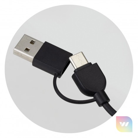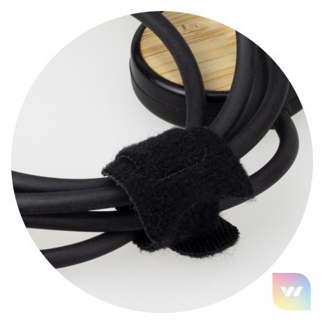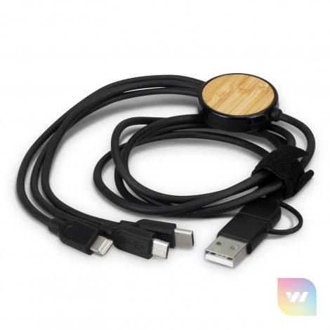 Versatile 120cm Type-C charging cable with a natural bamboo panel for prominent branding. It features dual inputs with Type-C and USB-A adaptors at one end and Type-C, Micro-B and Lightning connectors at the other. The cable can be easily tidied away with the supplied Velcro cable tie.