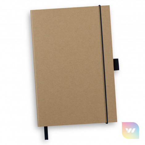 Stylish and functional medium-sized (approximately A5) notebook with a hard kraft cover. The notebook features 80 leaves (160 pages) of 70gsm lined cream paper made using sugarcane waste, with a sugarcane logo printed on the flyleaf. The notebook also features an elastic closure, a pen loop and a bookmark ribbon.