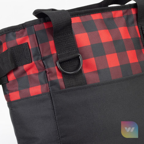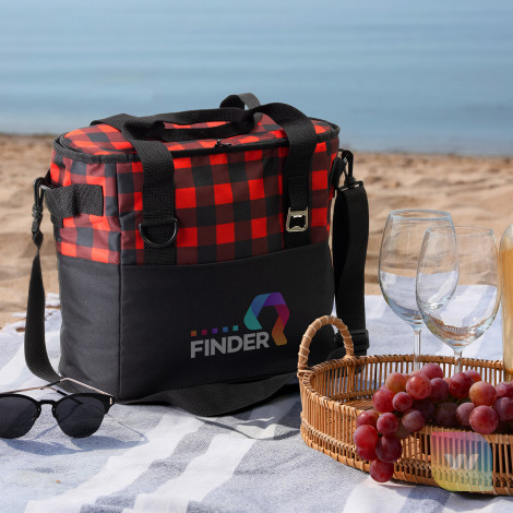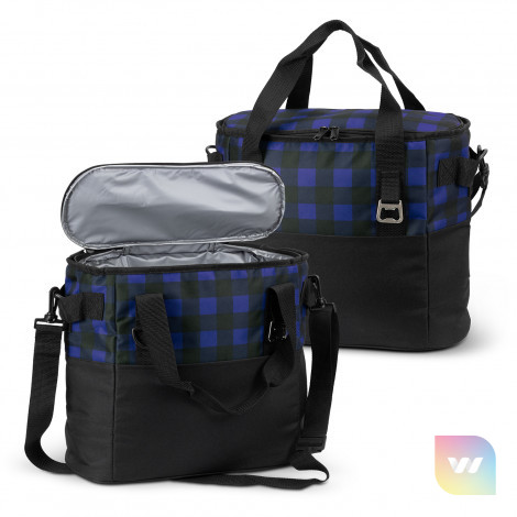 Large 19L cooler bag made from robust 600D polyester with a stylish checkered pattern. The zippered main compartment is insulated with PE foam encased in a water-resistant PEVA inner liner. It has woven carry handles, a handy bottle opener attachment, an adjustable shoulder strap, and a slip pocket.