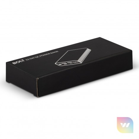 High performance 20,000mAh power bank that delivers up to 22.5W QC and 18W PD quick charge capability. Bolt is capable of charging up to three devices simultaneously and features a digital power gauge to show the power percentage remaining. The power bank has Micro-B and Type-C inputs with a Type-C and two USB-A outputs. This impressive power bank is presented in a printed black gift box. An optional EVA carry case and a triple connector cable are available on request.