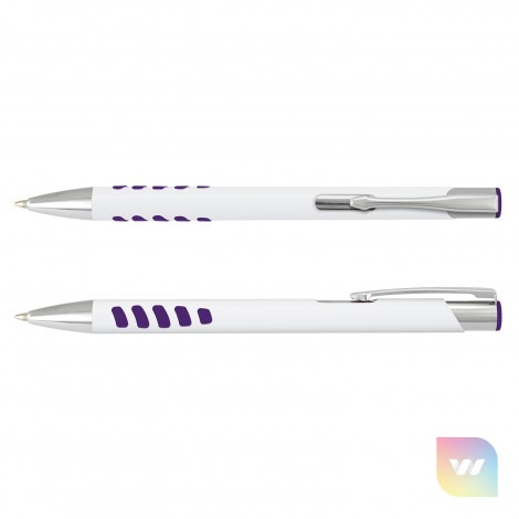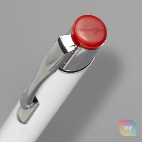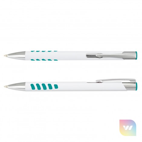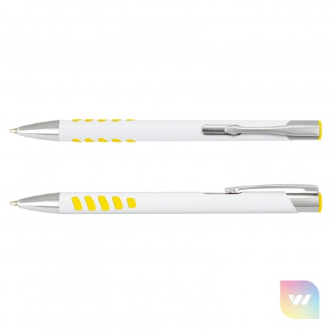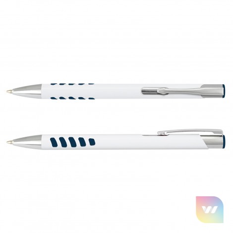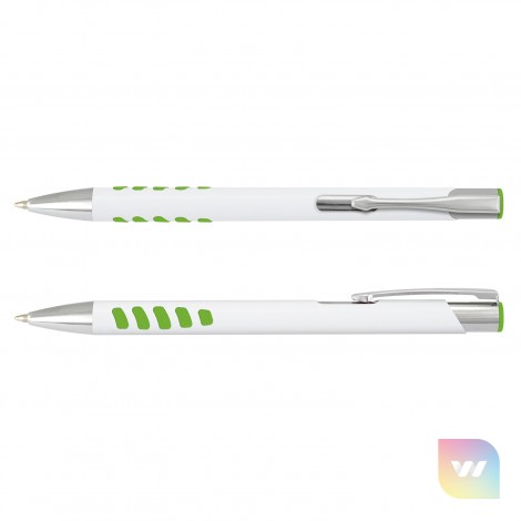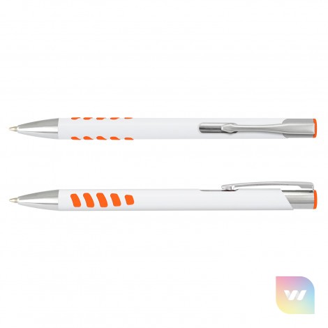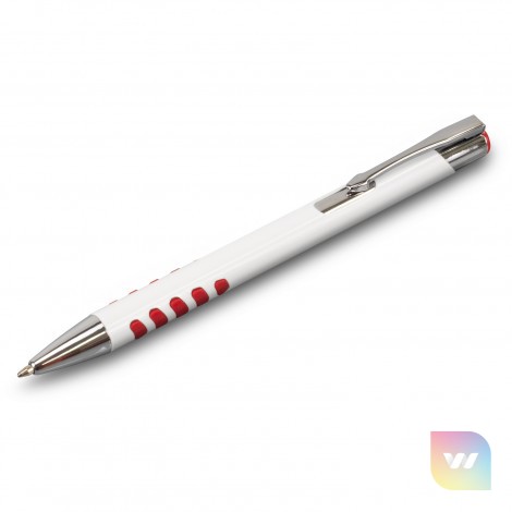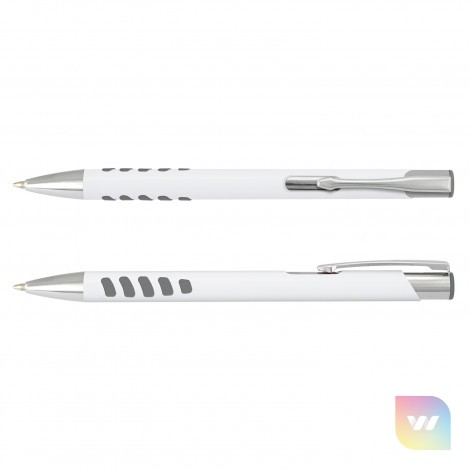 Retractable aluminium ballpoint pen with a painted gloss white barrel, shiny chrome accents and a coloured silicone grip with matching end cap. It has a large volume refill with 1200 metres of black German manufactured Dokumental ink. Panama can be presented in an optional pen sleeve.