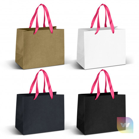 Medium-sized carry bag made from 180gsm paper with coloured ribbon handles. The gusset and top edge are reinforced for added strength.