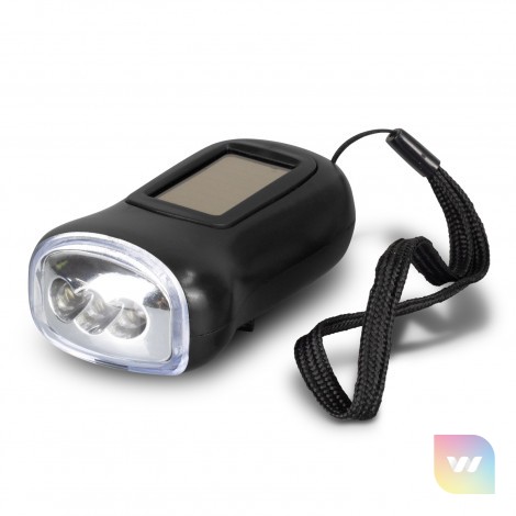 Handy rechargeable matte black torch with silver trim. Made from ABS plastic, Dynamo can be recharged using the crank mechanism or via the solar panel.