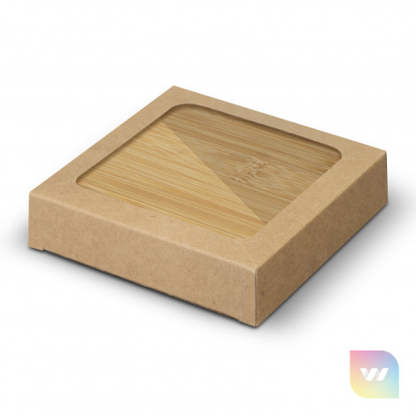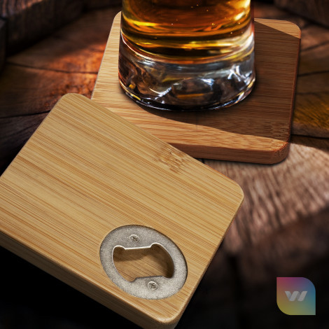Set of two square coasters made from natural bamboo. The coasters have a smooth bamboo surface with an iron bottle opener built into the underside. The set is presented in a natural gift box.