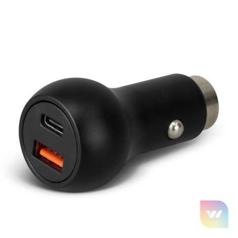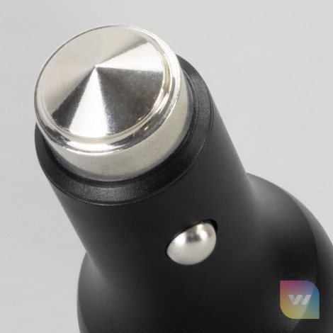 Handy car charger with dual charging ports and a built-in safety hammer for emergencies. Gideon can charge two devices simultaneously via a USB-A port and a Type-C port.