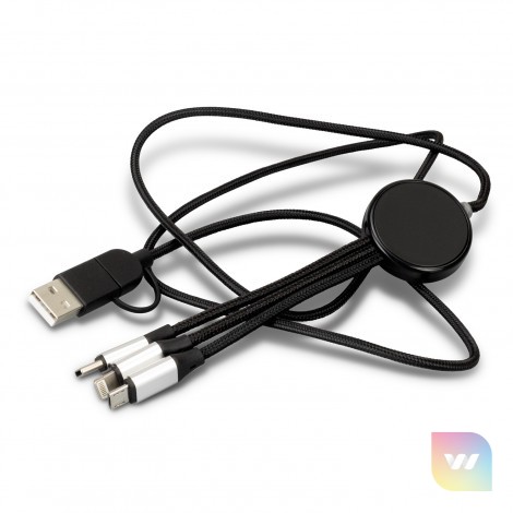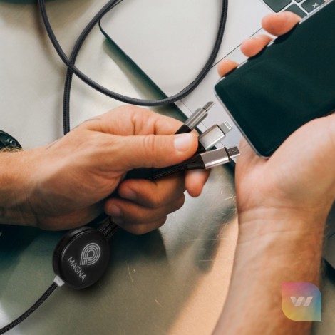 Illuminating 120cm Type-C charging cable with dual input USB-A and Type-C and triple output Type-C, Micro-B USB, and Lightning. Lumos features a built-in LED that illuminates the engraved branding when in use, and the braided cable increases durability.