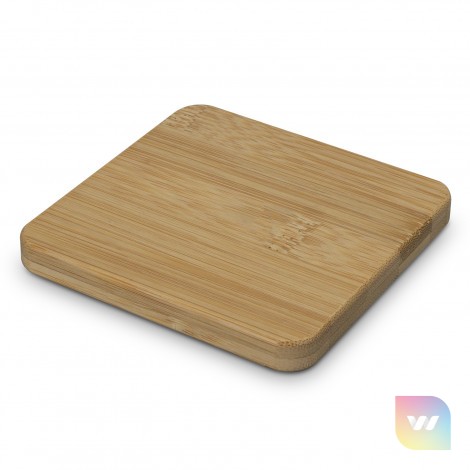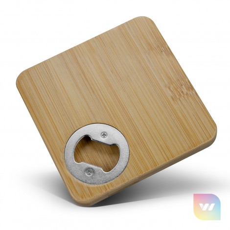 Square coaster made from natural bamboo. The coaster has a smooth bamboo surface with an iron bottle opener built into the underside.