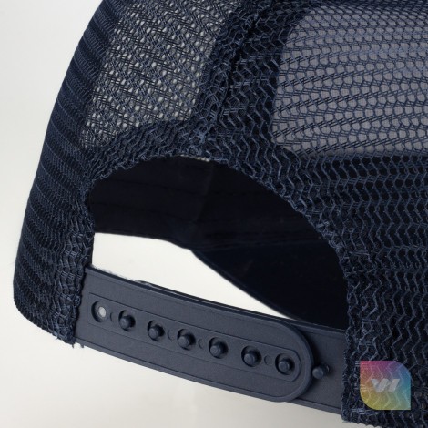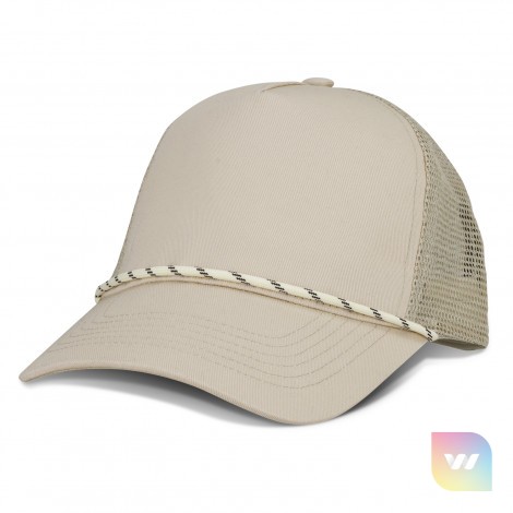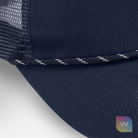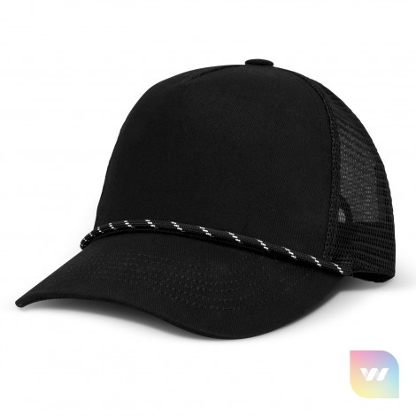 Structured five panel cap which is made from 100% cotton twill with a trucker-style breathable mesh back. It has a curved peak with a matching button, and decorative cord detailing across the peak. Other features include a sweatband and an adjustable snap back closure that allows one size to fit most people.