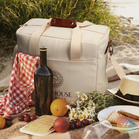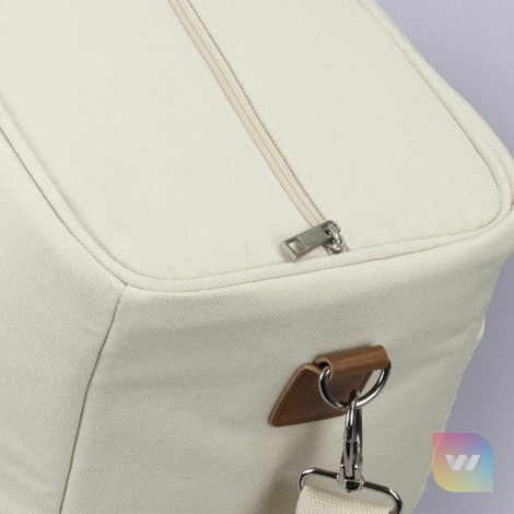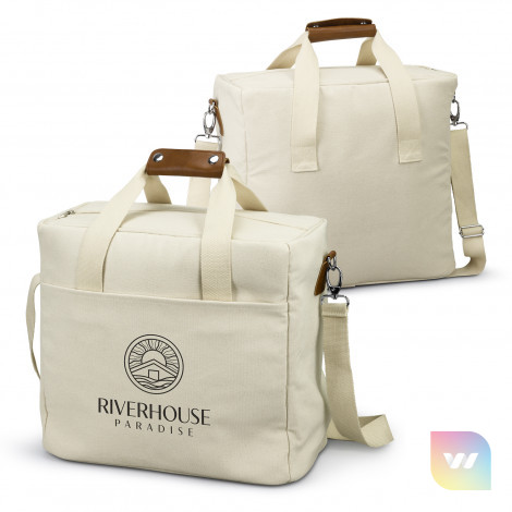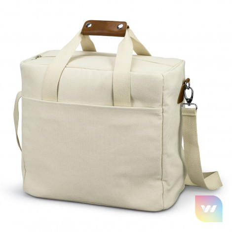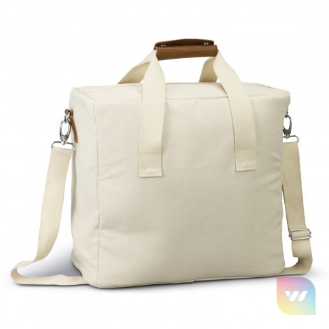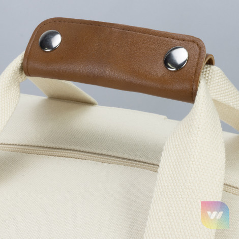 Spacious and stylish 26L cooler tote bag with PE foam insulation encased in a water-resistant PEVA inner liner. The outer construction is natural 100% 450gsm cotton canvas with stunning leather-look PU accents. It has cotton carry handles with a PU cuff and a removable, adjustable shoulder strap. Other features include a zippered top closure, piping details to hold the structure and a large slip pocket.