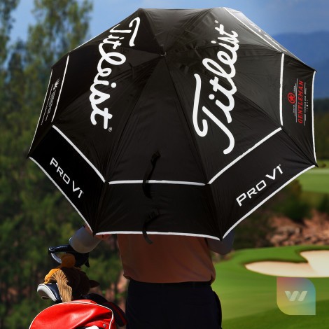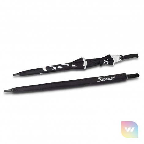 High-performance double canopy umbrella from Titleist, the golf experts. This impressive eight panel umbrella has a vented nylon canopy with two Velcro ties and fibreglass ribs. Made to withstand any elements, the umbrella uses an anti-inversion design to protect against strong winds, and the canopy has a UV lining to protect from the sun. The umbrella has a strong fibreglass shaft, a nylon sleeve and a moulded EVA foam handle and the Titleist logo is showcased on the canopy, sleeve, handle and hang tag.