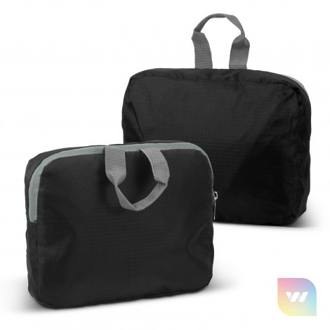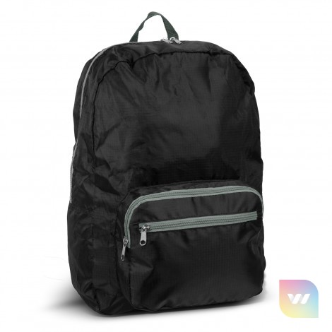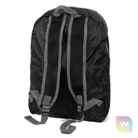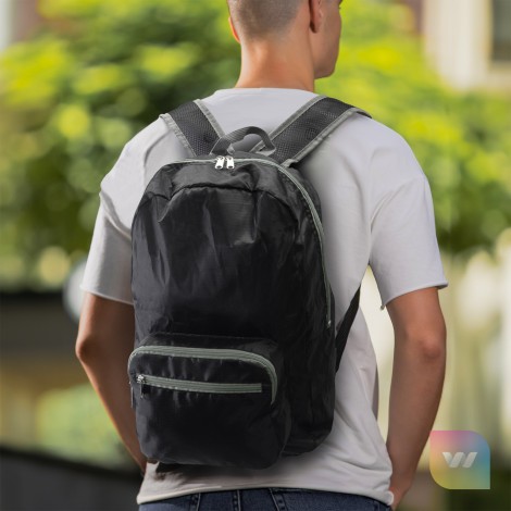 Handy 16L backpack made from durable 210D ripstop polyester and features lightly padded and adjustable shoulder straps. When not in use, the backpack can be folded away into a small carry pouch, making it perfect for travel. The pouch is discreetly zipped away into the bag when the backpack is in use. This lightweight backpack has a large zippered main compartment, as well as two additional zippered pockets in the front.