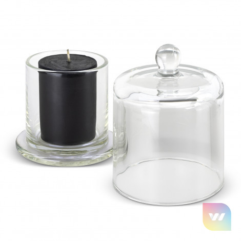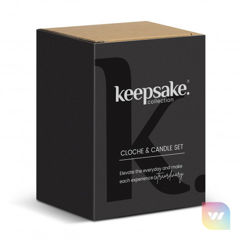 Elegant cloche and candle set to keep the candle dust free. The set comes with a clear glass cloche and a black unscented soy wax pillar candle. It is presented in a natural gift box with a Keepsake branded sleeve.