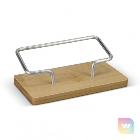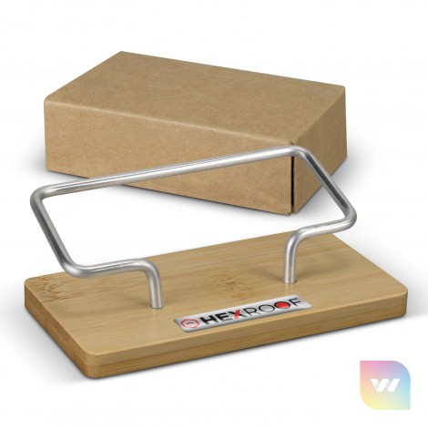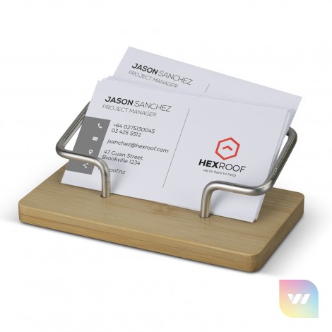 Crafted from bamboo and steel, this business card holder will accommodate up to 100 cards at the perfect viewing angle. The cards can be viewed both horizontally and vertically and is presented in a lightweight kraft carboard box. The bamboo base is finished in a clear coat, giving it a beautiful sheen, whilst the steel frame holds the cards in place.