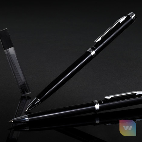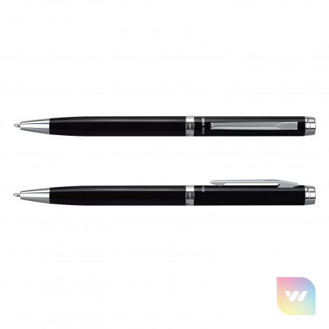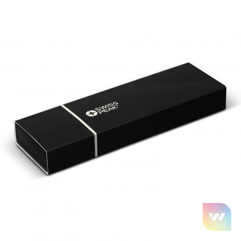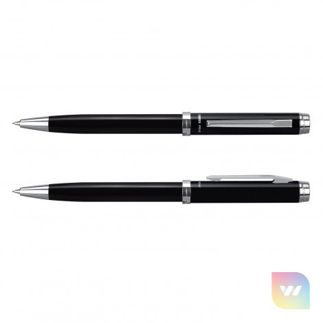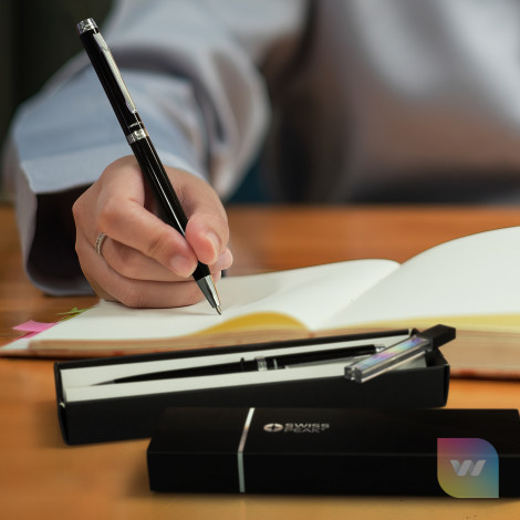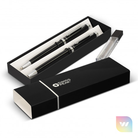 This elegant writing set from Swiss Peak includes a mechanical pencil and a twist-action ballpoint pen, both with stainless steel barrels, a gloss lacquered finish and shiny chrome trim. The pen comes with 1200m of black Dokumental ink, while the pencil includes additional 0.7mm leads in a protective case. This professional writing set is presented in a cardboard gift box with Swiss Peak branding.