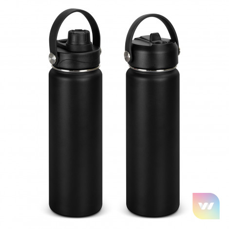 This BPA-free 800ml robust drink bottle is ideal for staying hydrated on the go. Combining stainless steel and polypropylene for a stylish drinking accessory. This double wall, vacuum insulated bottle features a powder coat finish and a secure screw on lid, with a choice of either a flip valve sipper, or a screw on chug cap. The Kinmont drink bottle blends practicality and style, highlighted by its carry handle and eye-catching silver rivet accents. This product is not dishwasher safe, and handwashing is recommended.