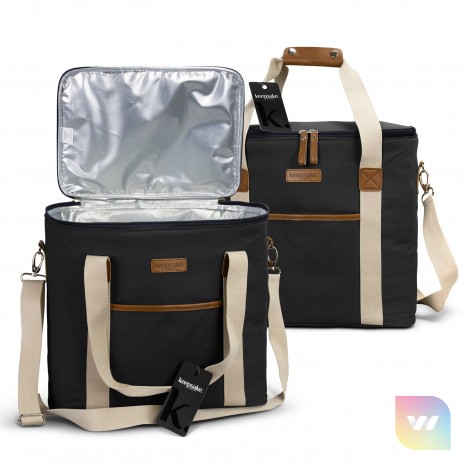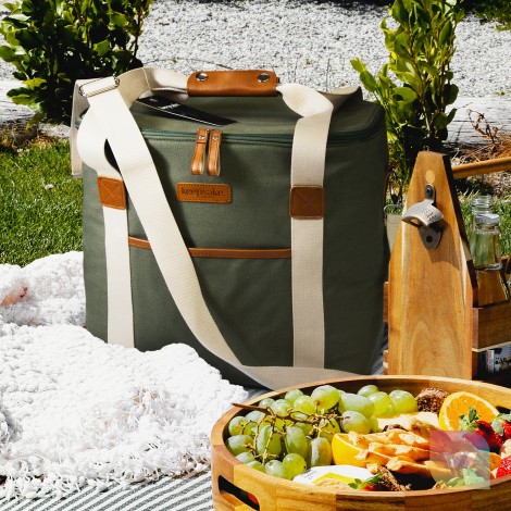 This classically designed, thick cotton canvas 30L cooler bag is the perfect addition to any summer picnic, or to transport chilled goods for a big day out. With on-trend natural tones, and faux leather trims, this cooler bag offers both style and sophistication. The bag is large enough to fit all your chilled goods plus more and features a conveniently located front pocket. It also has two sturdy carry handles one with an ergonomic dome-fastened grip, and the other a detachable and adjustable shoulder strap. The water-resistant PEVA/aluminium foil inner liner makes it easy to wipe clean, and the twin zip provides a wide opening for ease of use. The bag is presented with a Keepsake hangtag.