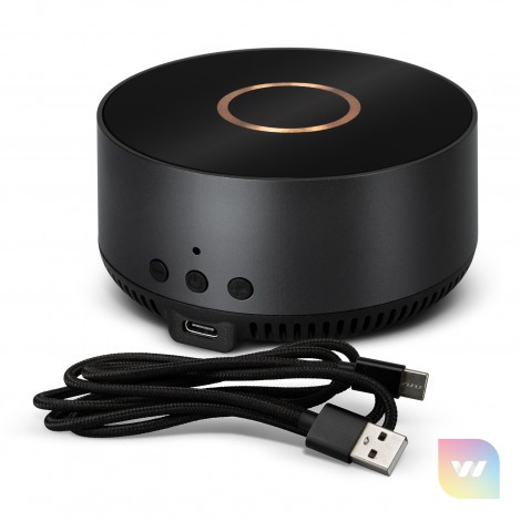 The Arc Wireless Charging Speaker blends innovation with elegance to deliver quality performance. Designed to seamlessly integrate into everyday life the speaker features both Bluetooth connectivity and wireless charging capabilities. Offering high-quality sound alongside intuitive functions, including track navigation, call management, and number recall, the speaker also boasts an LED light ring on the base to indicate charging status. The sleek black glass finish, refined copper accents, and quality components make the Arc Wireless Charging Speaker a standout accessory. Presented in a beautifully crafted INGENIO gift box, it is ideal for corporate gifting, and the ultimate brand statement. INGENIO - Designed to lead, built to last, made to inspire.