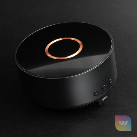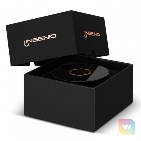 The Arc Wireless Charging Speaker blends innovation with elegance to deliver quality performance. Designed to seamlessly integrate into everyday life the speaker features both Bluetooth connectivity and wireless charging capabilities. Offering high-quality sound alongside intuitive functions, including track navigation, call management, and number recall, the speaker also boasts an LED light ring on the base to indicate charging status. The sleek black glass finish, refined copper accents, and quality components make the Arc Wireless Charging Speaker a standout accessory. Presented in a beautifully crafted INGENIO gift box, it is ideal for corporate gifting, and the ultimate brand statement. INGENIO – Designed to lead, built to last, made to inspire.