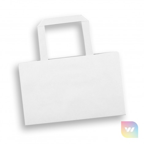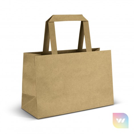 Small carry bag made from 180gsm paper with a reinforced base and square-folded 100gsm paper handles. This bag is landscape orientated with handles and gusset along the longer edges.