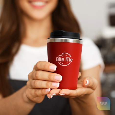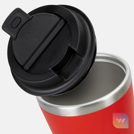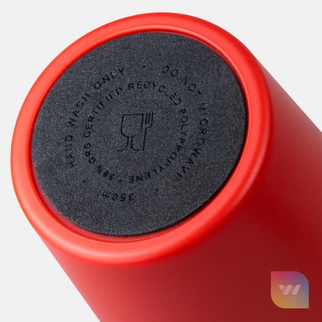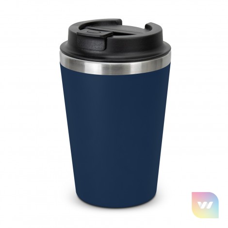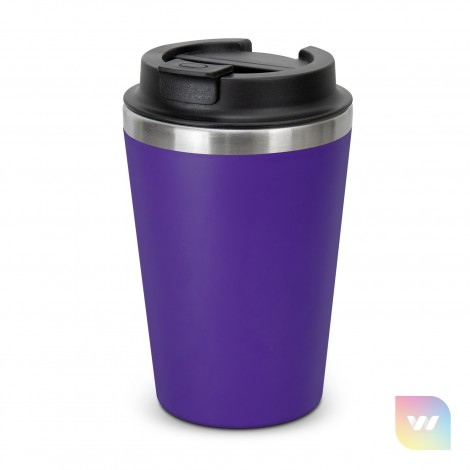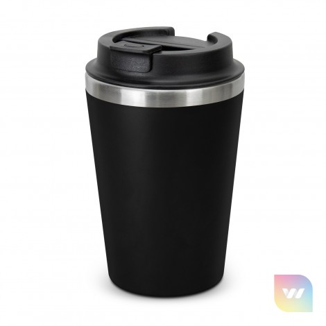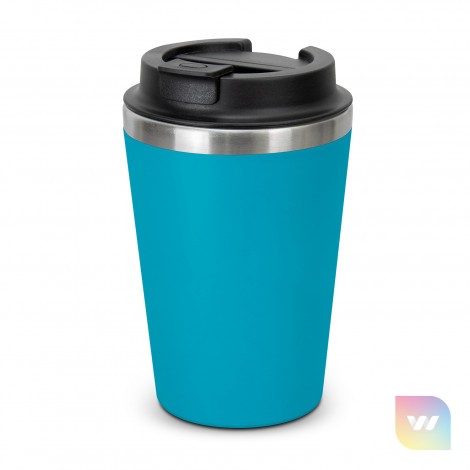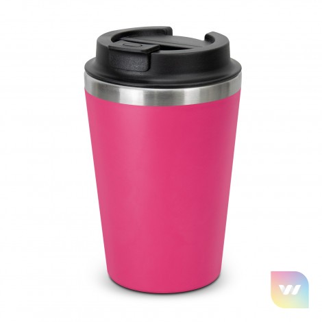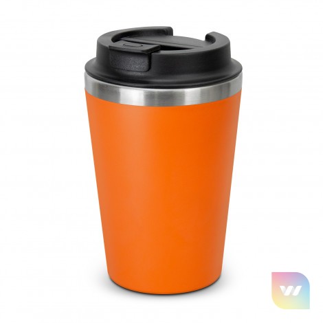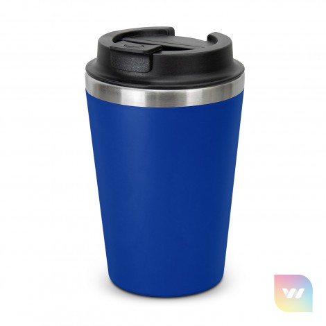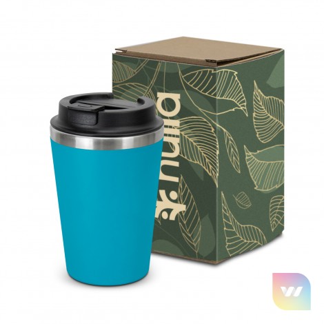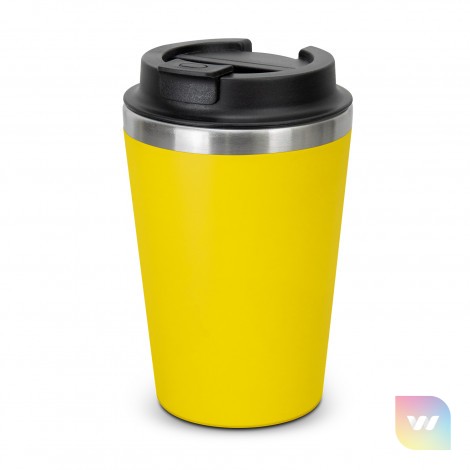Sleek 350ml double wall coffee cup manufactured from recycled polypropylene and stainless steel. Features a flip closure lid that folds all the way back for easy drinking. Available in a range of vibrant colours to match your brand.