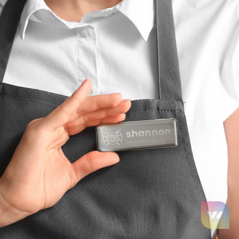 Rectangular metal name badge that features a magnetic back for easy attachment. The metal plate can be engraved for permanent, personalized name tags, or you can use the removable plastic cover to easily swap out names, making it a versatile option for staff or event use.