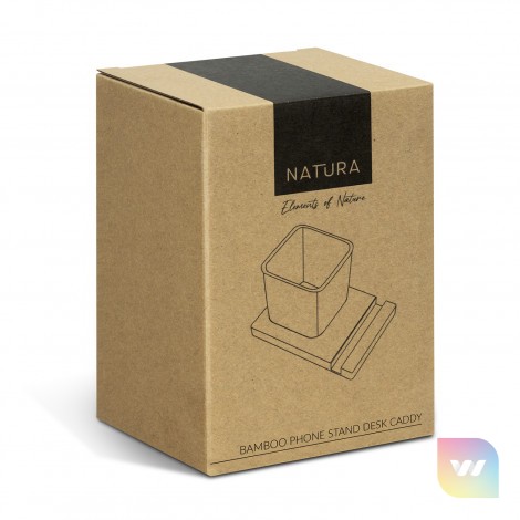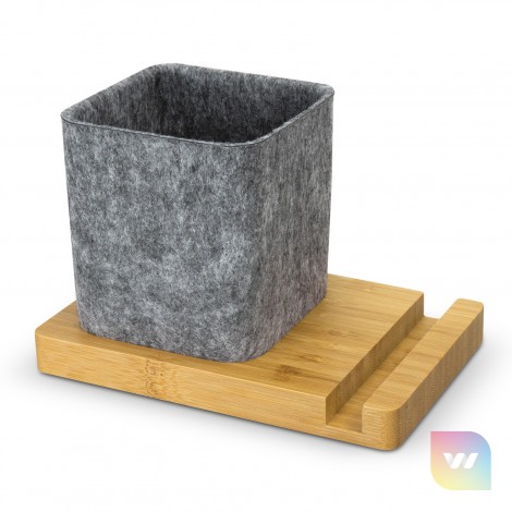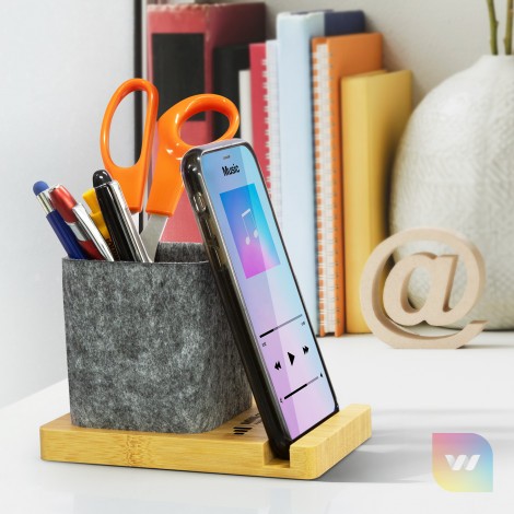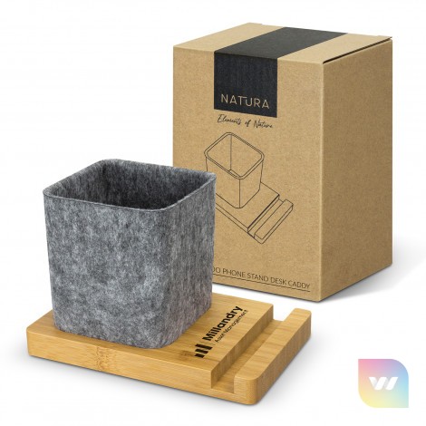 Keep your desk organized with this stylish desk caddy that doubles as a phone stand. Crafted from GRS certified recycled felt on a bamboo base, it's perfect for storing stationery items. The versatile stand supports phones in both horizontal and vertical positions. This practical and stylish product is presented in natural kraft gift box with NATURA branding.