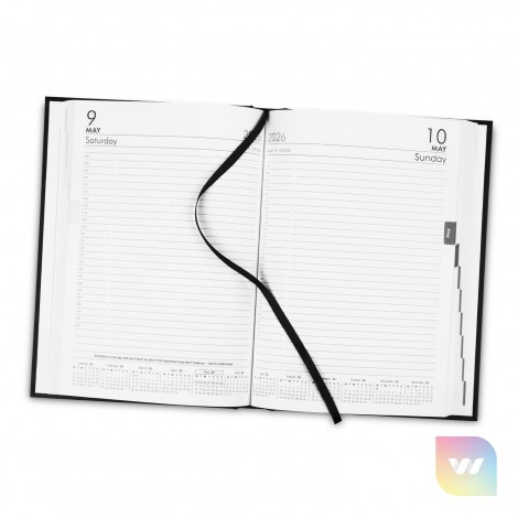 Stay organised with this durable A5 diary featuring a textured black hard cover foil branded with the year and model. Features a ribbon marker and a Jan-Dec printed edge index for easy reference. The day to view format includes 30-minute appointment times, printed monthly tabs for quick reference, and handy extras like personal info pages, school terms, and monthly planners. Perfect for dedicated planners at work, school, or home.