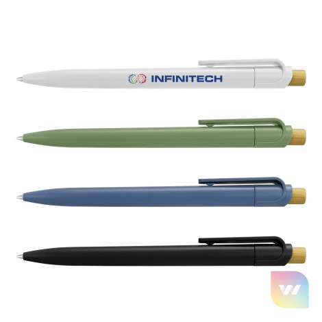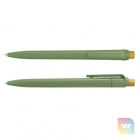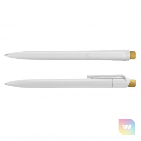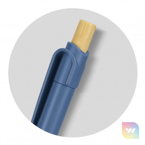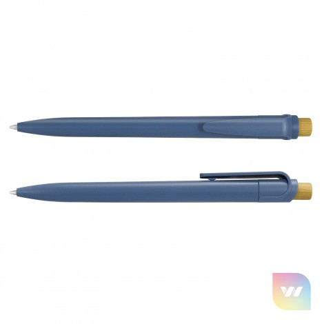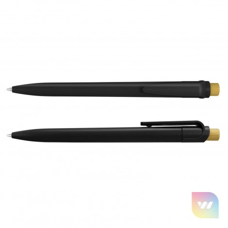 This push-action ballpoint pen is made from recycled ABS plastic and features a smooth matte barrel complemented by a natural bamboo pusher. The wide clip is designed to securely attach to notebooks, pockets, or folders, while 1000m of black Dokumental ink ensures reliable writing performance. An optional pen sleeve is available at an additional cost.