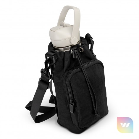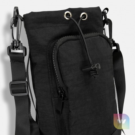 Crafted from textured washed polyester the Reign bottle bag features an adjustable bungee cord and toggle closure to accommodate bottle sizes up to 1L. A zippered front pocket allows you to safely store small essentials like your phone and keys. The adjustable and removable shoulder strap means it can be worn cross-body or over one shoulder – whatever suits your style. Perfect for errands or outdoor adventures.