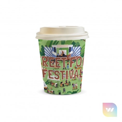 Medium-sized 230 ml (8oz) compostable paper coffee cup and lid. The cup features an aqueous coated lining to prevent leaks and maintain cup integrity and can be customised with full colour printing - perfect for showcasing your brand in cafes, at events, or even during daily commutes. Both the cup and lid can be composted and are suitable for hot and cold drinks. A production lead time of 17 working days applies to this product.