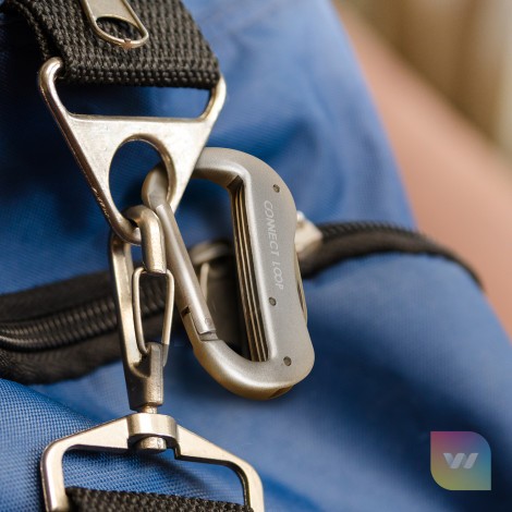 Handy five function stainless steel multi-tool which includes a carabiner for attaching the tool to a belt or a bag. The carabiner laser engraves to a natural etch.