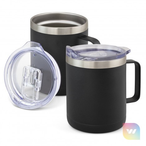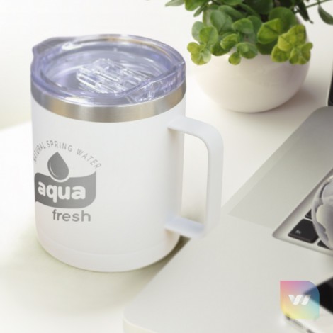 Premium 400ml double wall, vacuum insulated stainless steel coffee cup which will keep drinks hot or cold for hours. It has a stunning powder coated finish and a transparent push on lid with a splashproof sliding closure. Zeus is BPA-free and has a soft non-marking base. It laser engraves to a shiny steel finish and is presented in a black gift box. This product is not dishwasher safe and handwashing is recommended.