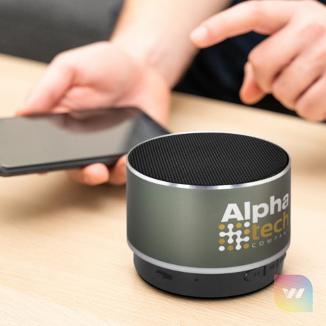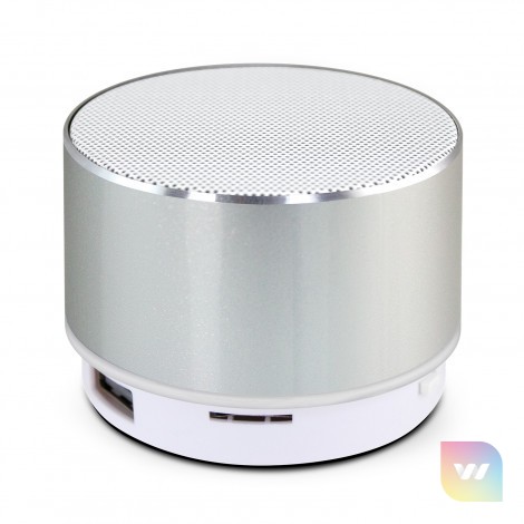 Stylish 3W, metal Bluetooth speaker which is compatible with all mobile devices that support Bluetooth. It has a wireless connectivity range of over 10 metres and can also be used with an audio cable. The speaker has a radio function, a colourful light display, a built-in microphone for phone calls and music playback can be controlled directly from the speaker. Playing time is 1.5 hours and it is easily recharged from a laptop, a power bank or a USB mains adapter. Oracle laser engraves to a natural etch and is presented in a gift box with a Micro-B USB cable, an audio cable and an instruction leaflet.